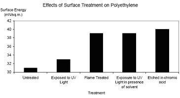 For traditional structural adhesives to bond low surface energy substrates such as polyolefins, surface treatments have been used to raise the substrate surface energy by as much as 30% to better meet the adhesive surface energy. Figure 3 shows the effect of various surface treatments on polyethylene.